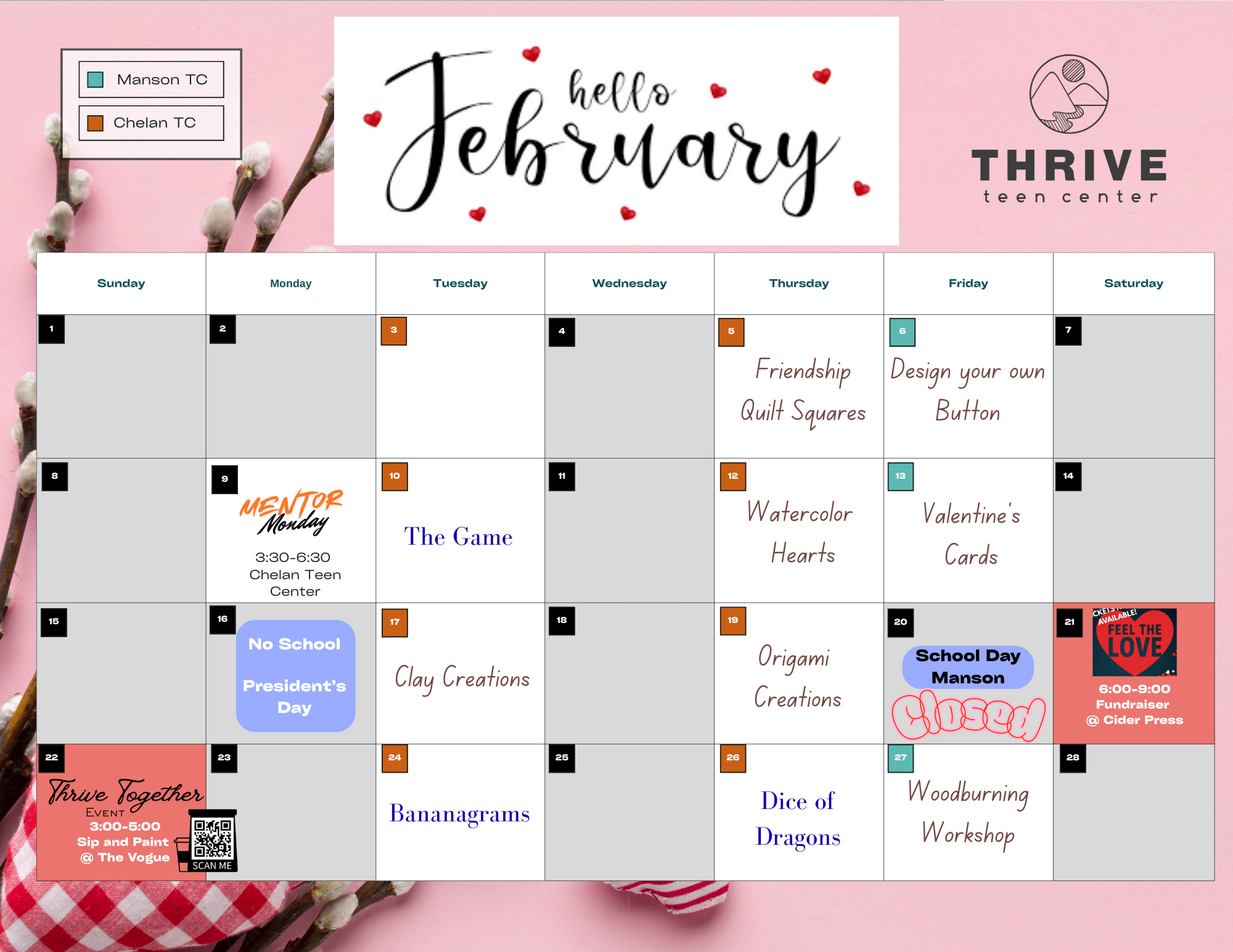 Both teen centers are open to all Chelan and Manson middle and high school students, and we will be serving a free meal every time we’re open! Interested in volunteering at the Teen Center or donating a meal?